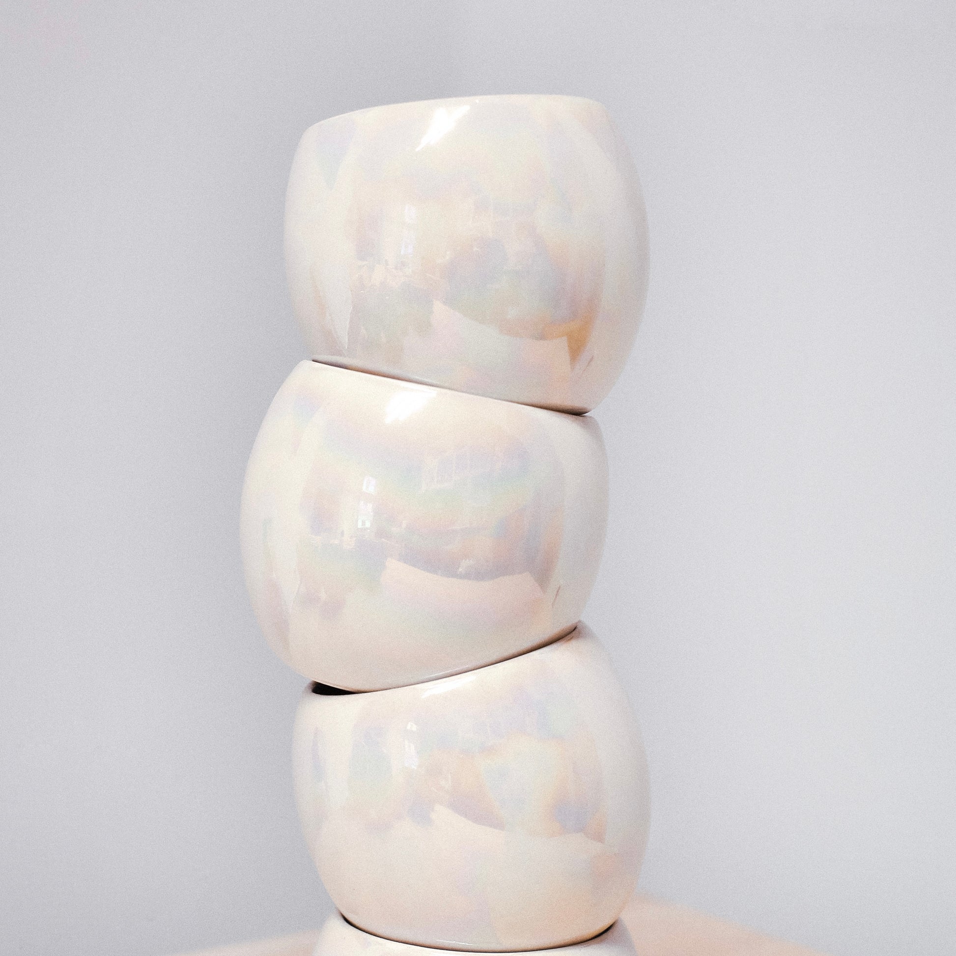 Kalíšek ze světlé kameniny s přírodním dekorem, transparentní glazurou a perleťovým efektem.