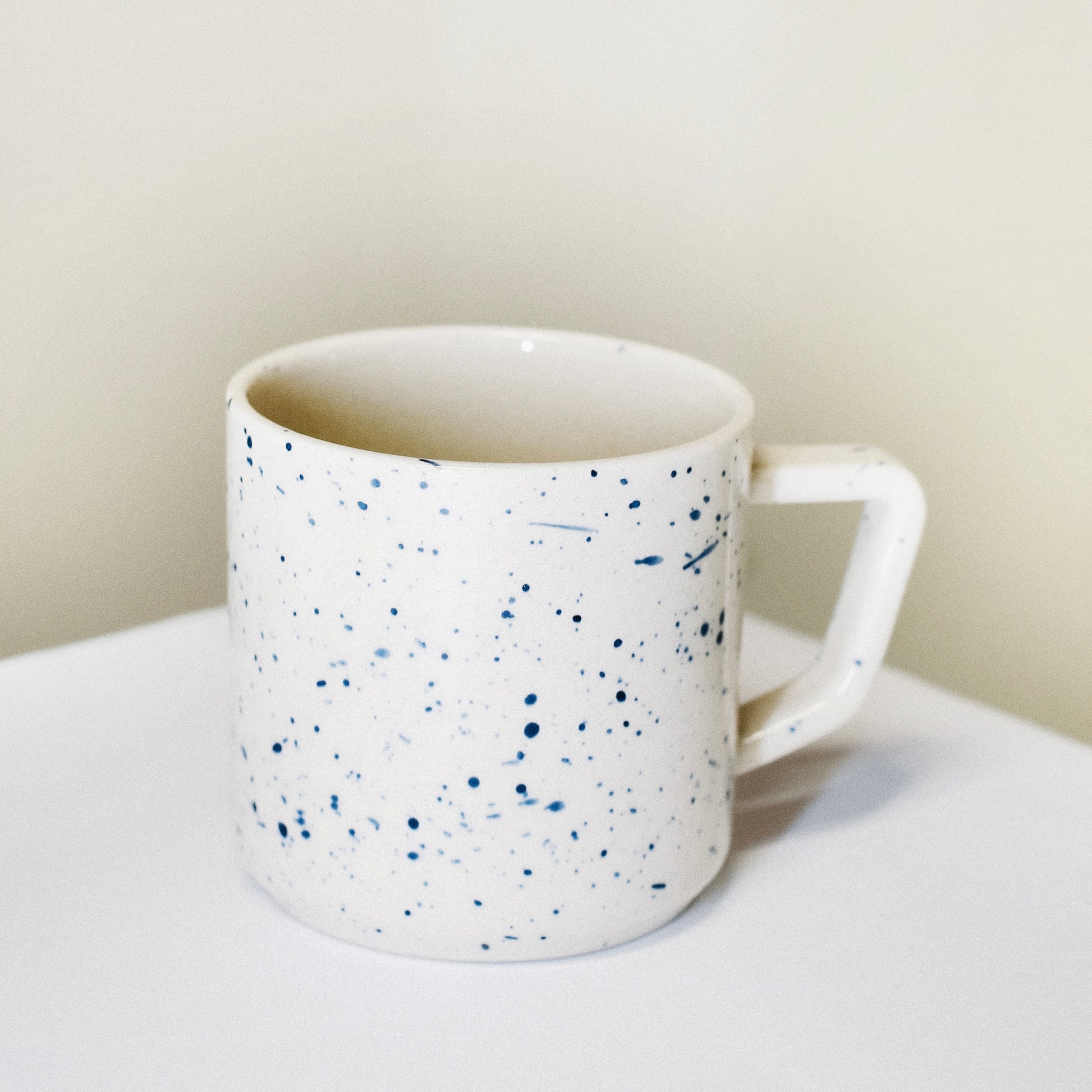 Hrnek ze světlé kameniny s modrým dekorem a transparentní lesklou glazurou.