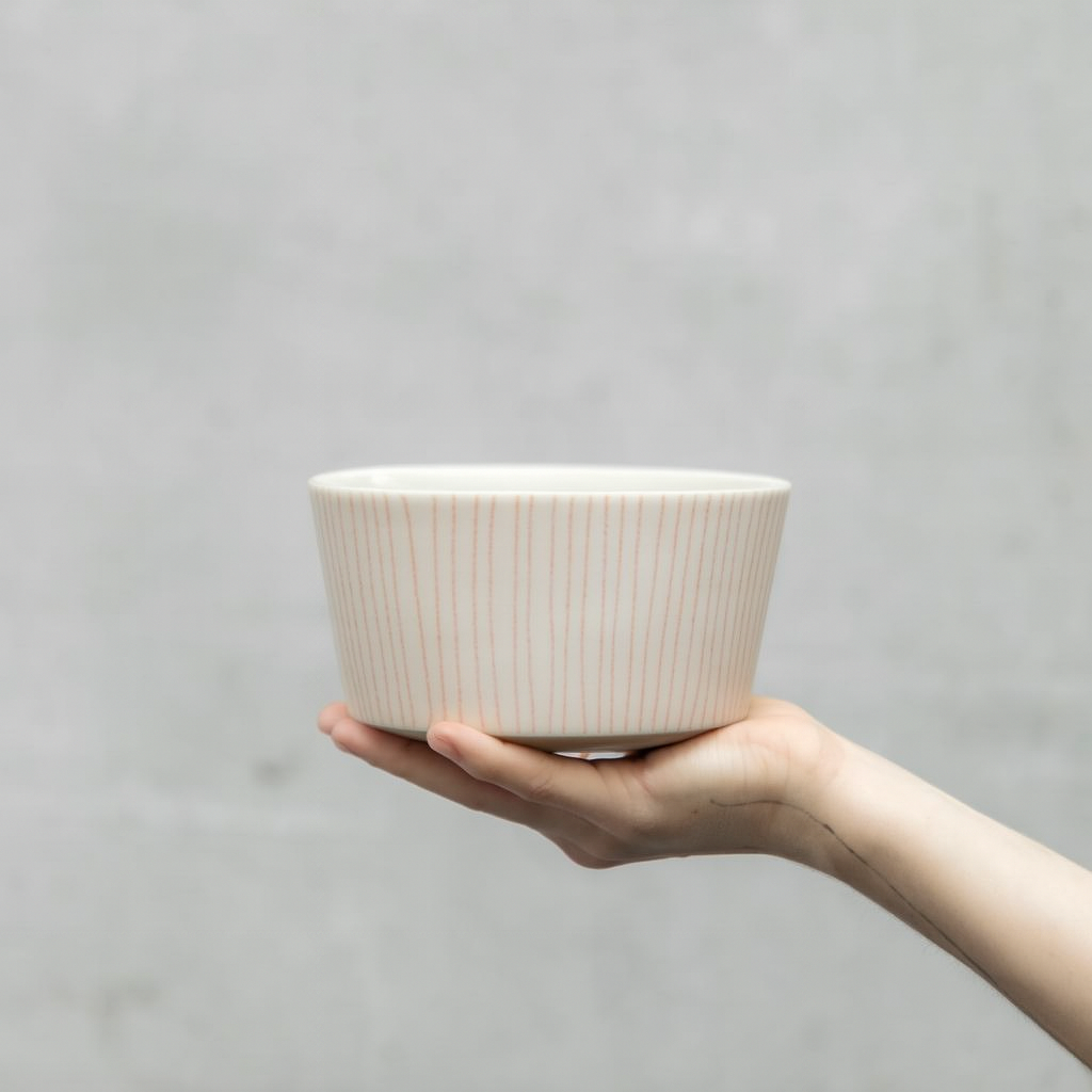 Miska ze světlé kameniny s detailem jezevčíka a transparentní lesklou glazurou.