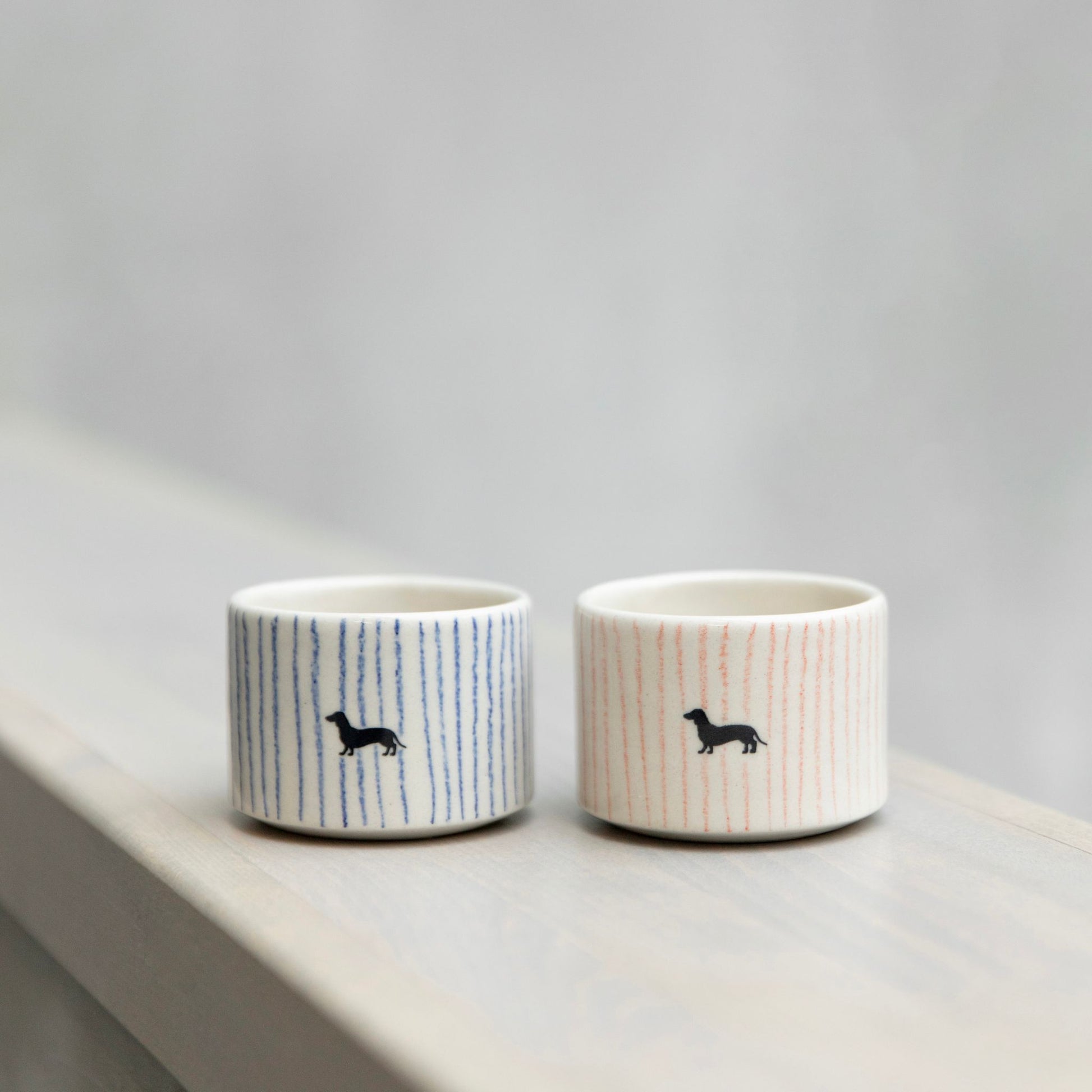 Set dvou kalíšků ze světlé kameniny s detailem jezevčíka a transparentní lesklou glazurou.