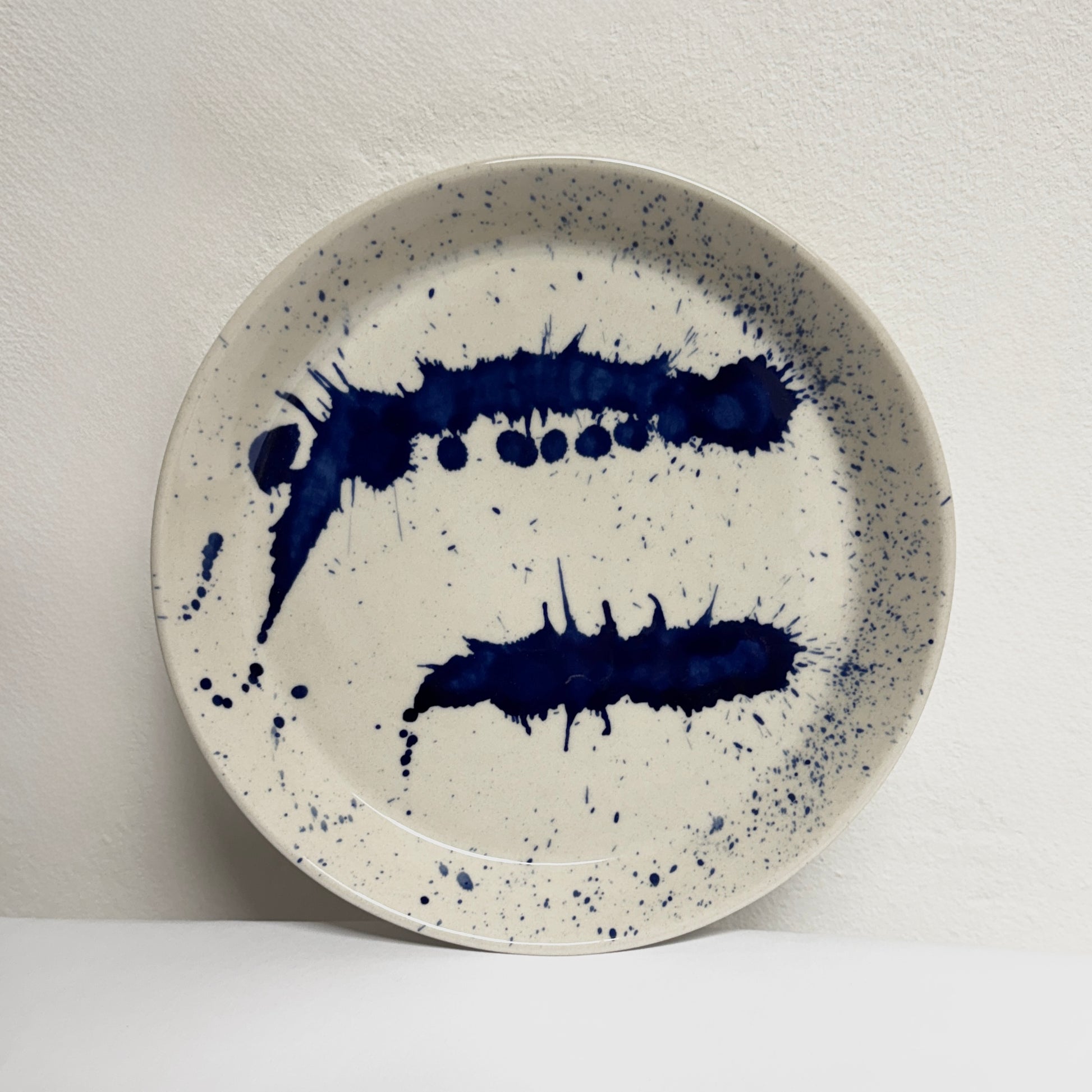 Talíř ze světlé kameniny s blue splashes a transparentní lesklou glazurou.