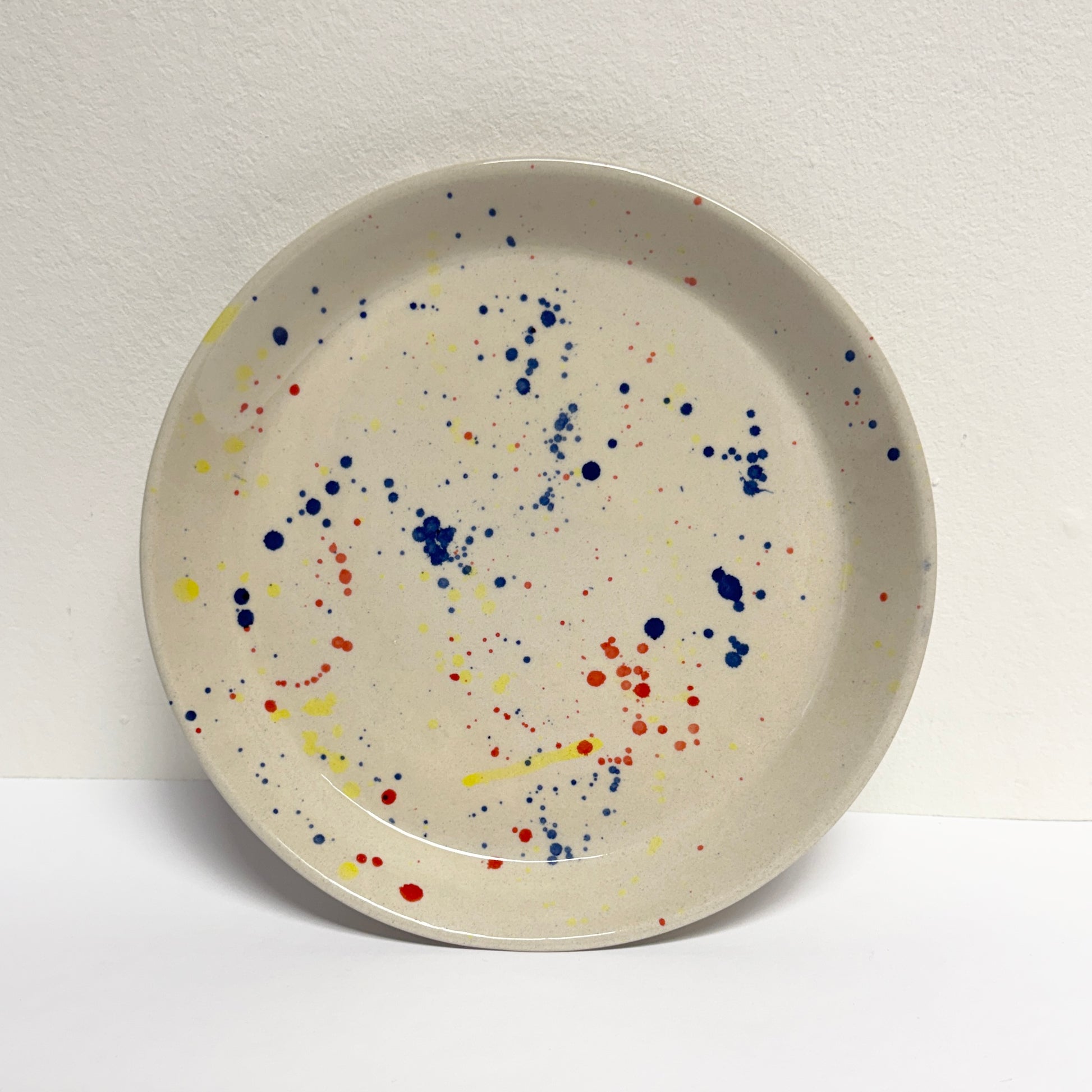Talíř ze světlé kameniny s barevnými kapkami a transparentní lesklou glazurou.